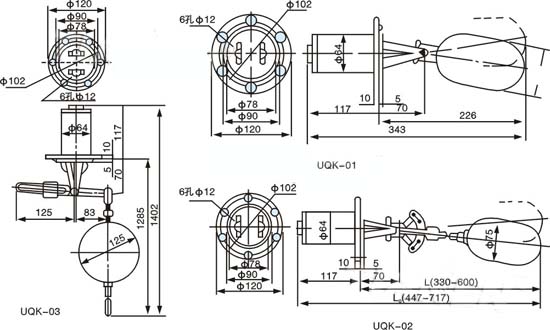2、UQK-01型和UQK-02型浮球液位控制器為水平方向的安裝形式,UQK-03型浮球液位控制器為垂直方向的安裝形式。