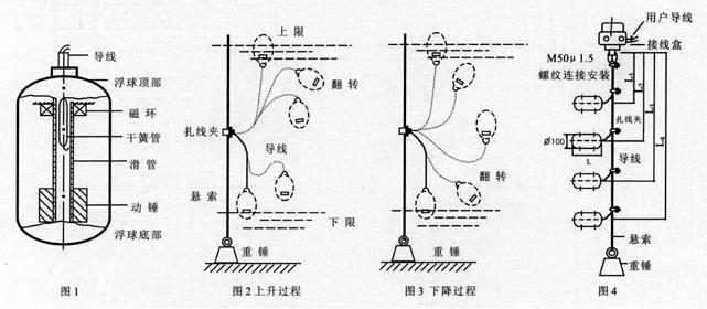 液位在下限時,浮球呈正置狀態(tài)浮在水面上,浮球內(nèi)的動錘脫離干簧管與磁環(huán)的區(qū)域,干簧管保持原有的一對觸點斷開,一對觸點閉合的狀態(tài)。當液位上升到上限時浮球翻轉(zhuǎn)倒置,動錘落到磁環(huán)干簧管吸合區(qū),使磁路閉合,輸出觸點狀態(tài)迅速轉(zhuǎn)換(浮球內(nèi)使用水銀開關(guān)的原理相仿)。