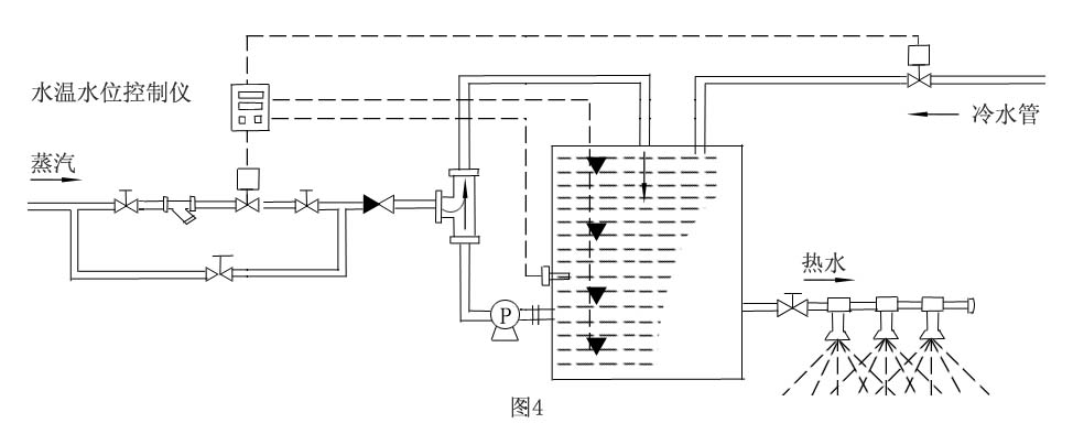通過管道汽水混合加熱器一次性加熱后,熱水直接送往浴池?zé)崴浼捌渌钣盟膱龊希Q為單向開式系統(tǒng)如圖4。